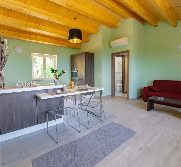 Appartamento compatto e funzionale con soggiorno-cucina e zona pranzo. La camera dispone di un letto matrimoniale e un letto singolo, mentre il soggiorno offre un divano letto matrimoniale. Ideale per famiglie o piccoli gruppi.