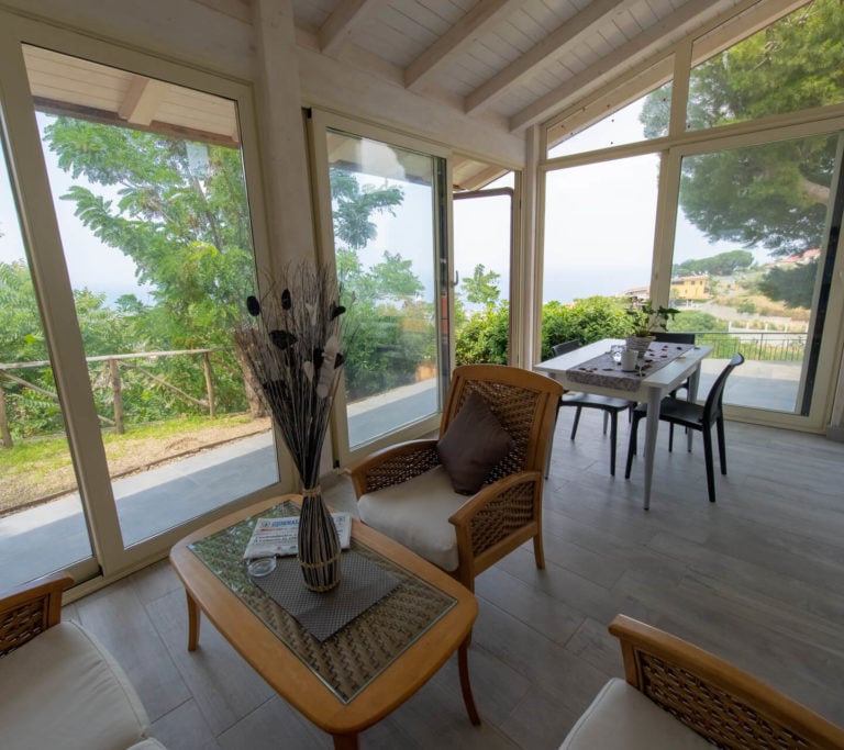 Villetta indipendente con terrazza soprastante e veranda esterna attrezzata con salottino e tavolo da pranzo. Dispone di soggiorno-cucina con lavastoviglie, una camera matrimoniale, una camera con due letti singoli e bagno con doccia. Ideale per chi desidera maggiore privacy e spazi esterni.